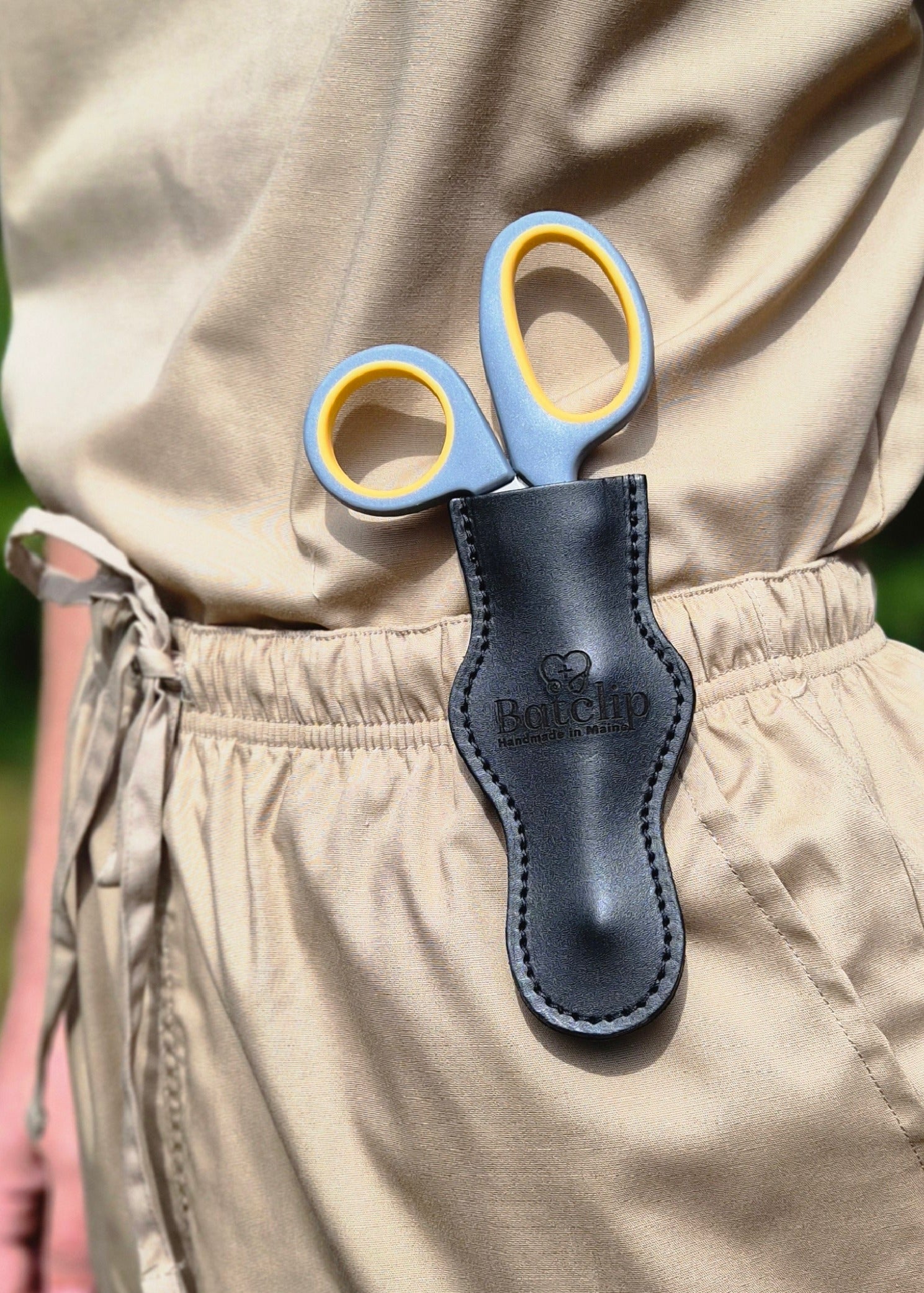 THE FEEL OF FINE LEATHER. The BATCLIP SHEARS are individually handmade in Maine from the same high-quality handpicked leather cowhides used for the stethoscope version of the BATCLIP. The holster easily fastens to a belt via a military-grade steel clip. When shears are holstered, the entire package is lightweight, balanced, and simply feels right in the hand.