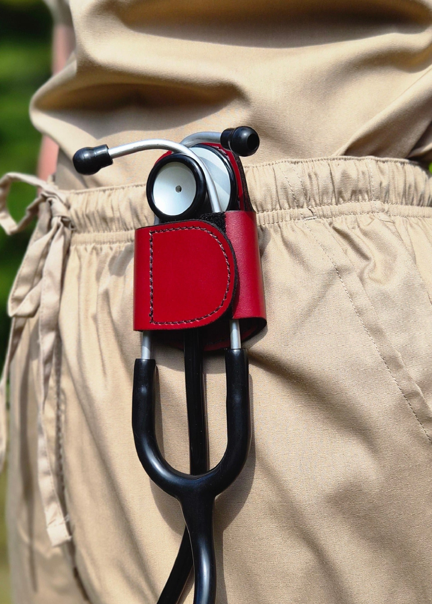 DESIGNED BY AN EMERGENCY PHYSICIAN seeking a solution to repeated misplacement and loss of his own stethoscopes. His criteria for an ideal stethoscope carrying solution included extreme portability; durability against water, weather, and age; a fail-safe scope-securing mechanism; quick scope access; and simple scope re-holstering.