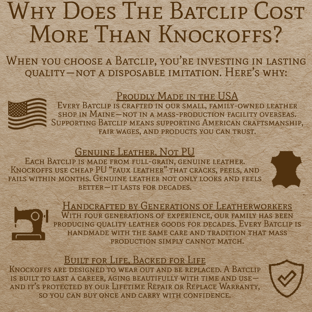 NO HASSLE WARRANTY. We’re proud of our products. (Our other BATCLIP allows secure no-loss stethoscope carrying.) Unlike the makers of single-use disposable medical goods, we make BATCLIP holders to last for a lifetime. Made with love and care in a small multi-generation family-owned leather shop, the BATCLIP works better, lasts longer, and has achieved a superior reputation because of its success in actual use. Thus, if anything ever goes wrong with your BATCLIP holster, we will repair or replace it.