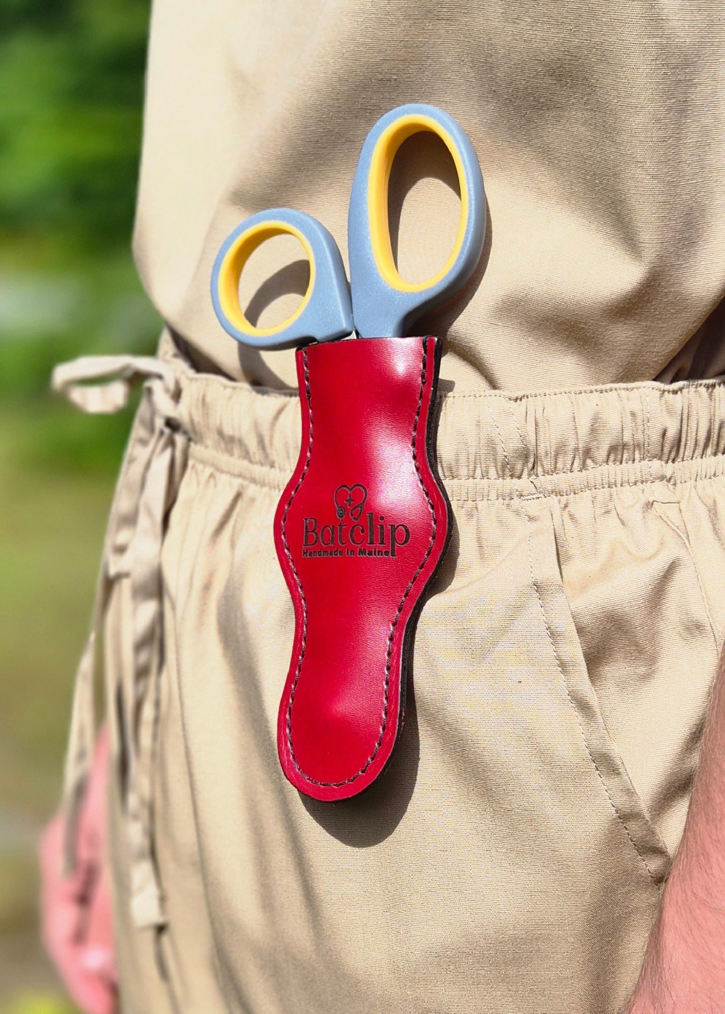 THE FEEL OF FINE LEATHER. The BATCLIP SHEARS are individually handmade in Maine from the same high-quality handpicked leather cowhides used for the stethoscope version of the BATCLIP. The holster easily fastens to a belt via a military-grade steel clip. When shears are holstered, the entire package is lightweight, balanced, and simply feels right in the hand.